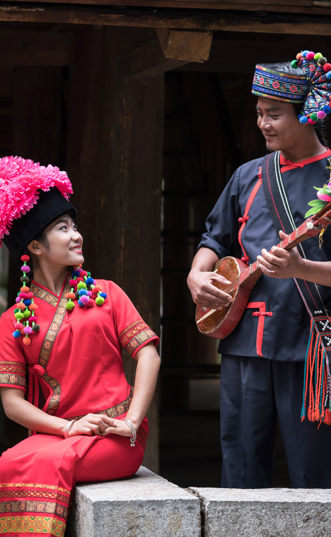 云南壯族主要聚居在文山州,人口114萬(wàn),民間的村寨大多依山傍水。壯族擅長(zhǎng)種植水稻,有太陽(yáng)崇拜和長(zhǎng)老崇拜的風(fēng)俗,視銅鼓為重器,厚愛(ài)銀飾,善烹制五色花米飯,能歌善舞,熱情好客。進(jìn)入景區(qū)壯族村,迎面有祭祀龍王的龍柱,兩邊是先民繪制的天王崖畫(huà)和為紀(jì)念傳說(shuō)洪水泛濫時(shí)幫助先民度過(guò)劫難而建的石葫蘆亭。祭祀玉皇大帝的昊天閣和傳說(shuō)能驅(qū)邪納福的碩大銅鼓聳立在廣場(chǎng)兩側(cè)。桿欄式和麻欄式民居、壯族青年社交休憩的“情廊”、村...
